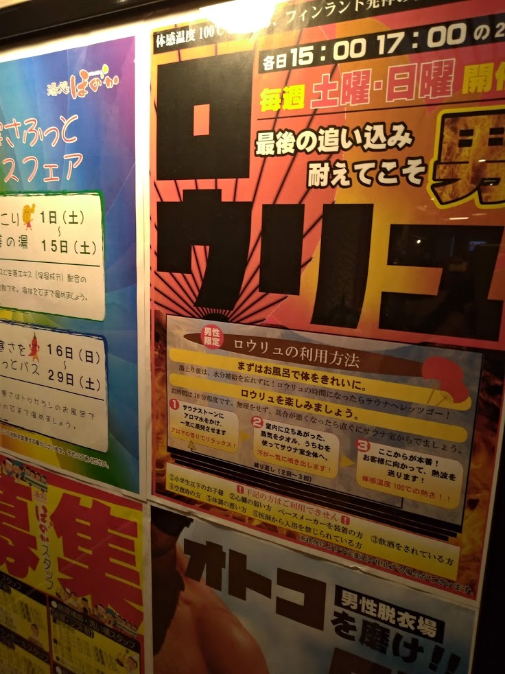 サウナは通常のもの(90度ほどでひな壇3段のMAX20人程度)と高湿度低温タイプの塩サウナと銘うった(70度ほど平屋で10人程度)の二種類あり。
